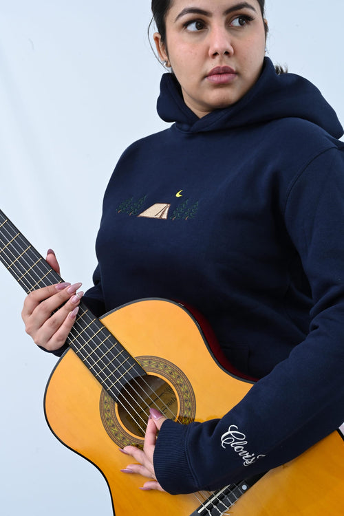 CLOVISX Nightfall Camp Embroidery Hoodie (Royal Midnight) – 380 GSM Heavyweight Fleece Unisex Pullover, 80/20 Cotton Blend, Kangaroo Pocket
