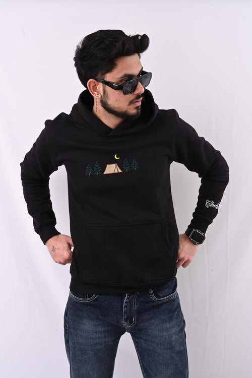 CLOVISX Nightfall Camp Embroidery Hoodie (Onyx Black) – 380 GSM Heavyweight Fleece Unisex Pullover, 80/20 Cotton Blend, Kangaroo Pocket